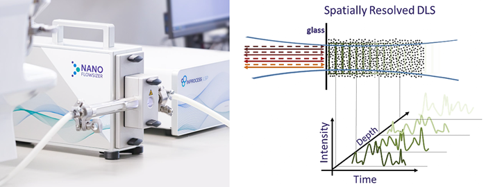 Fig. 1. Left: NanoFlowSizer with an equipped flow cell performing inline SR-DLS particle size measurements. Right: Depth Resolved measurement of backscattered intensity fluctuations, the base of SR-DLS. Image Credit: Image courtesy of Albert Grau-Carbonell et al., in partnership with ELRIG (UK) Ltd.