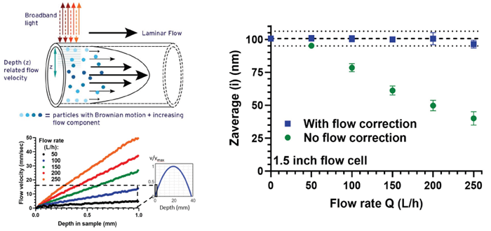 Fig. 2. Left, top: Poiseuille flow profile that develops for laminar flow conditions in the flow cell. Left, bottom: Corresponding velocity profiles of the suspension as a function of depth from the wall of the flow cell. Right: Measured particle size at different flow rates. Image Credit: Image courtesy of Albert Grau-Carbonell et al., in partnership with ELRIG (UK) Ltd.