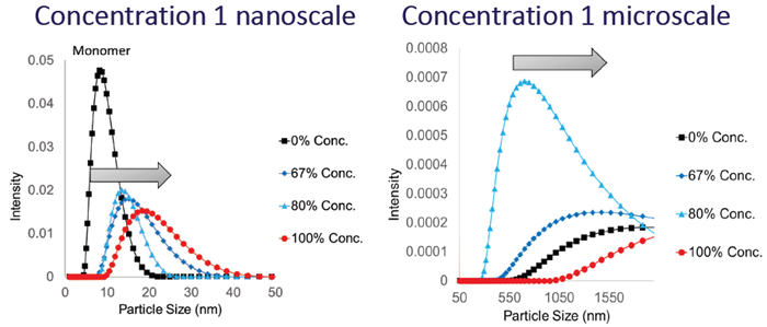 - Formation of larger micron-sized particles that persist (irreversible) happens concurrently