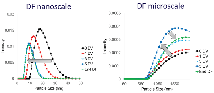 - Larger particle formation was seen as early as Conc. 1 processing and can persist through Conc. 2. The NanoFlowSizer helps the early detection of filter fouling issues.