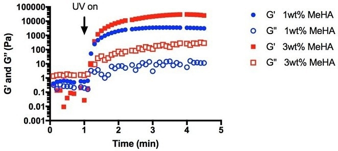 - The macromer solution (MeHA and I2959) was exposed to UV light after one minute, which caused the plateau of moduli to occur before five minutes