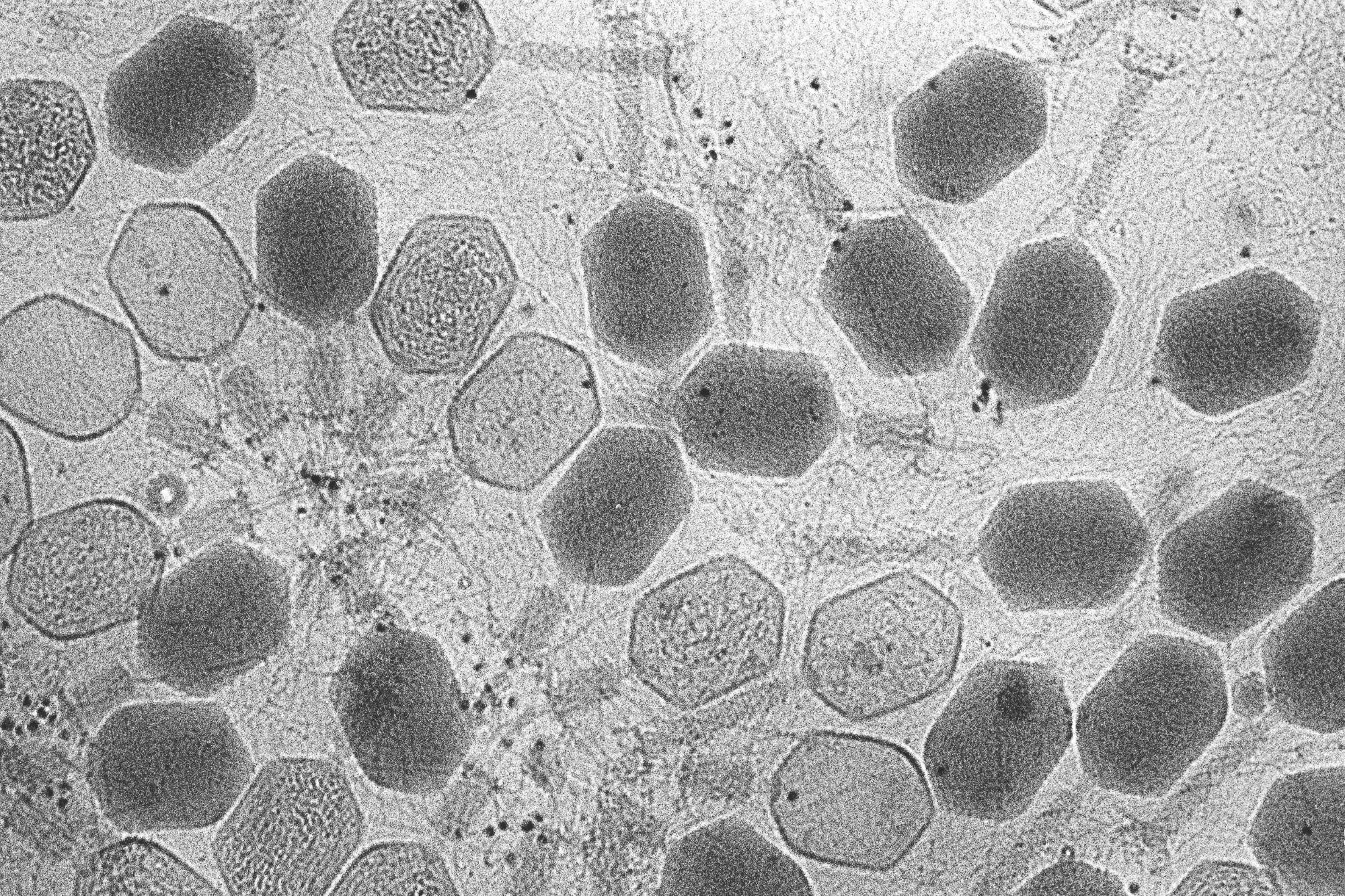 A group of bacteriophages, viruses that infect bacteria, imaged using transmission electron microscopy. New research sheds light on how bacteria fight off these invaders without triggering an autoimmune response. Image Credit: ZEISS Microscopy, CC BY-NC-ND 2.0
