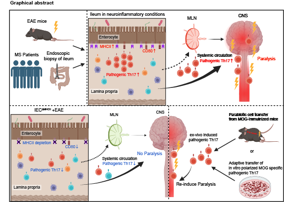 While current therapies for MS often target B cells, our study highlights the gut as an important therapeutic site. Modulating intestinal microbiota or antigen-presenting activity of IECs represents new approaches to treating autoimmune neurological diseases.