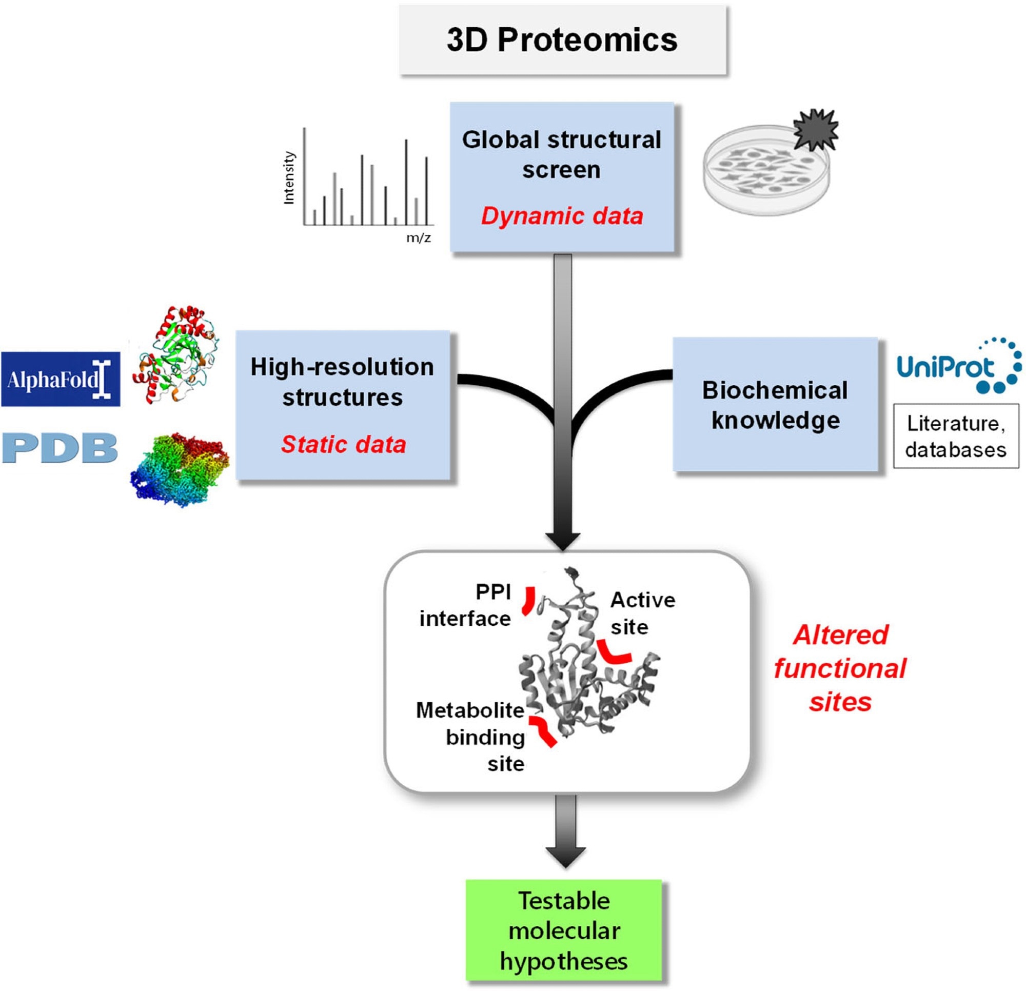 3D Proteomics. Integrating proteome-wide structural dynamics data (such as LiP-MS data) with high-resolution 3D protein structures and prior biochemical knowledge constitutes a new type of functional omics screen. 3D proteomics generates a wealth of molecular hypotheses about structural and functional changes in individual proteins with peptide-level resolution and much enriches the systems-wide functional information that can be obtained in proteomics screens.