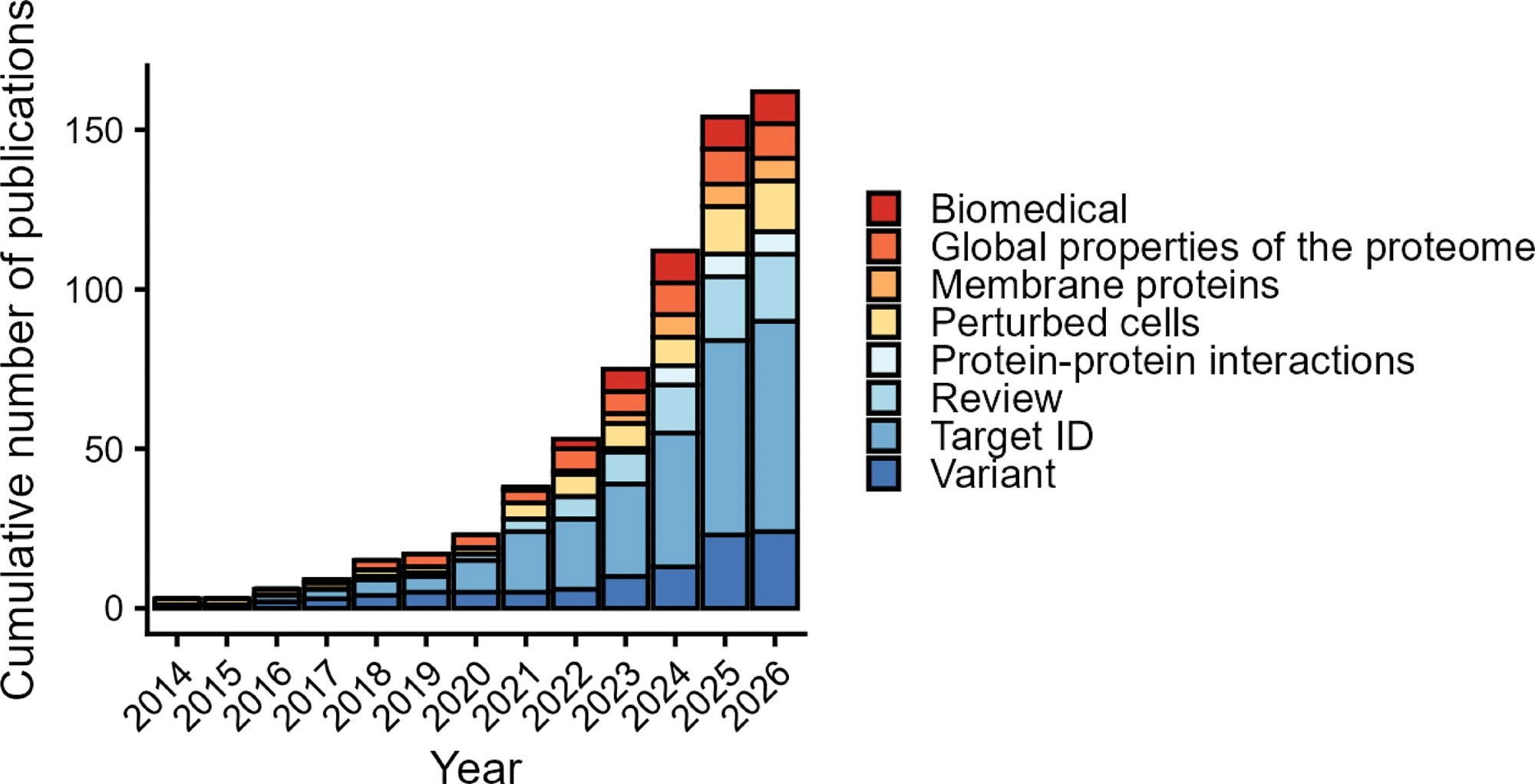 LiP-MS is being widely applied. The plot shows the cumulative number of publications using LiP-MS or a variant in every year since the method was described (6) until submission of the revised version of this review. Broad categories of applications or methodological variants are indicated with color. We note that studies where LiP-MS was applied to single purified proteins were not included in this graph.