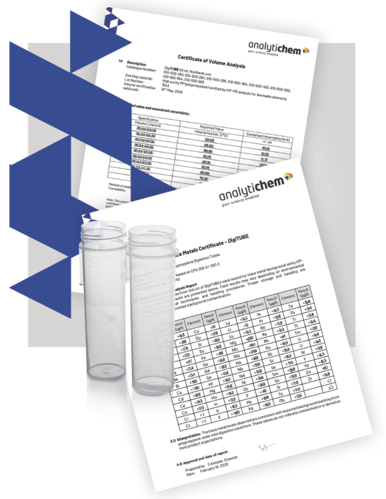 At AnalytiChem, we remain committed to continuously improving our products to ensure they are fit for purpose and suitable for even the most demanding applications. Through our understanding of our customers’ application needs and commitment to quality and analytical confidence, we have now secured both Trace Metal Analysis and Volume Certification for our DigiTUBEs disposable digestion tubes.